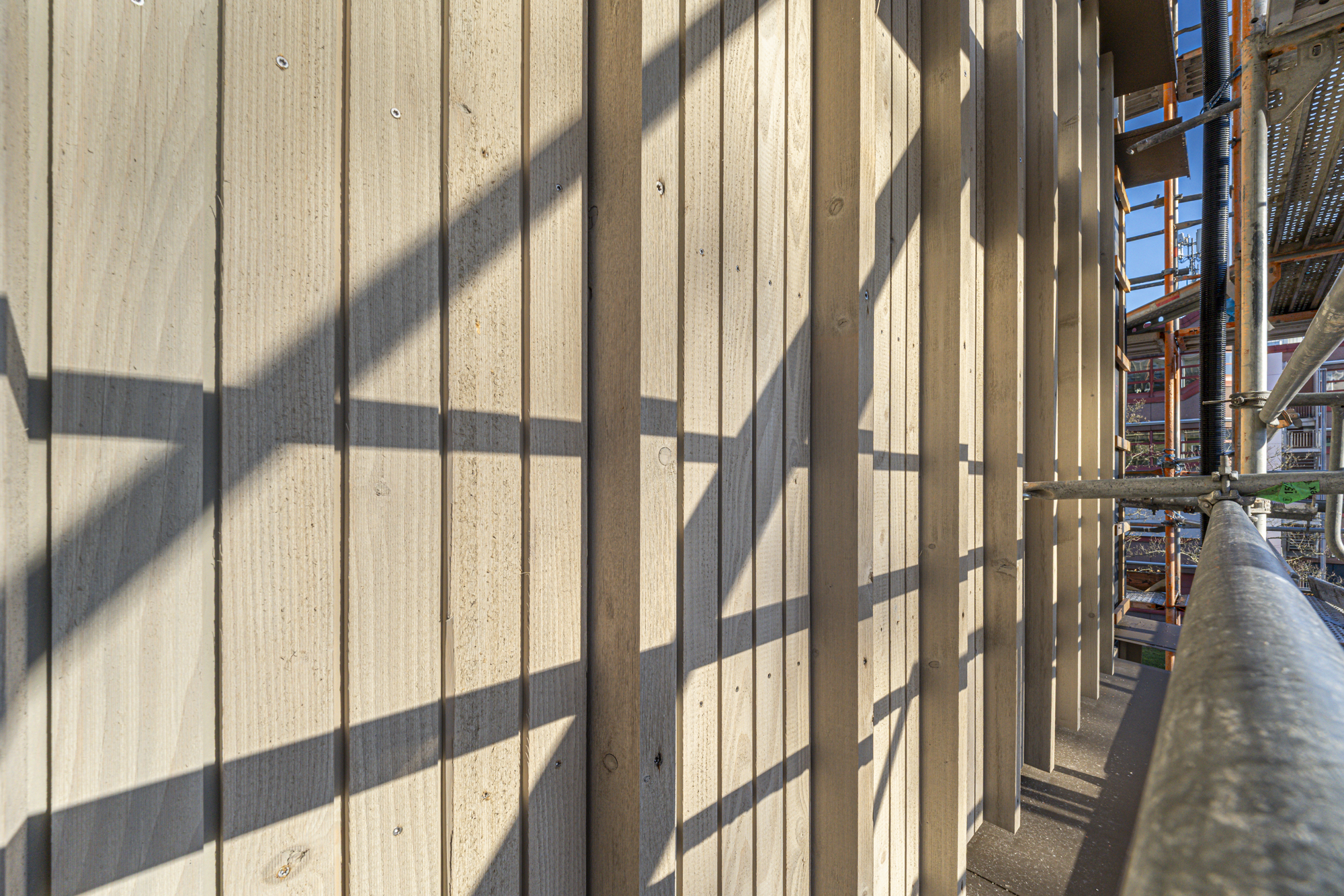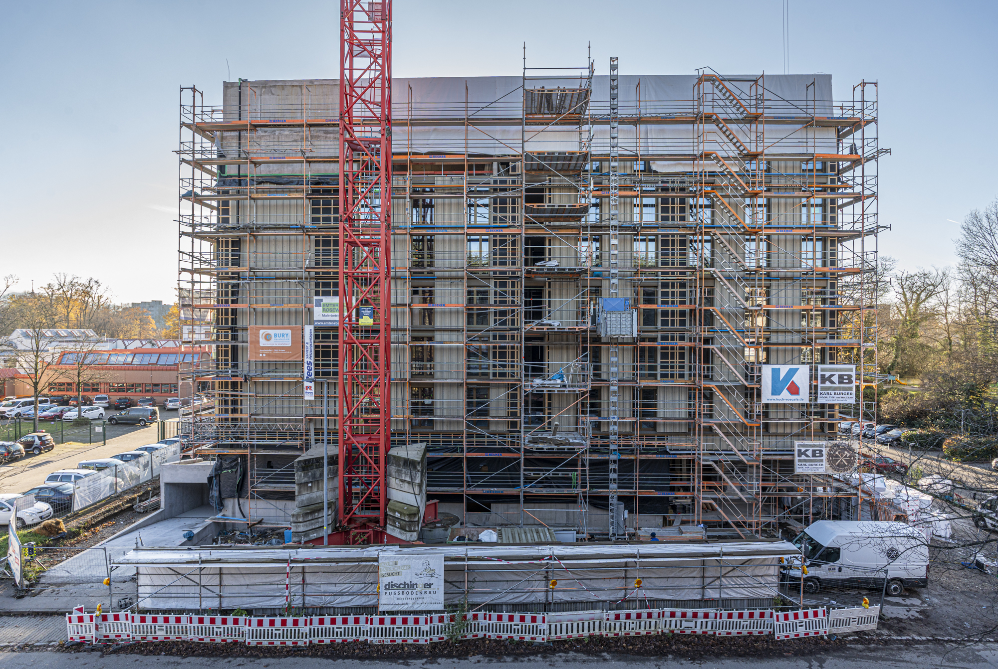 Auf der Baustelle von WIR:SÜD wächst Geschoss um Geschoss: Vorfertigte Holzmodule, bronzefarbene Fenster und präzise Montage sorgen für sichtbaren Fortschritt. Mehr lesen